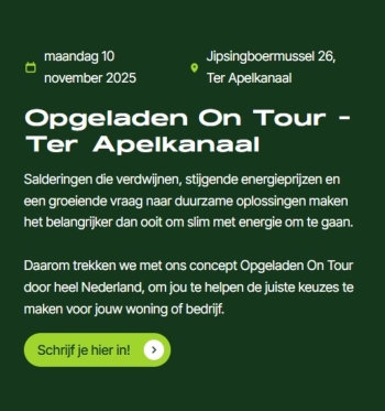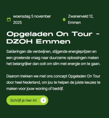 Salderingen die verdwijnen, stijgende energieprijzen en een groeiende vraag naar duurzame oplossingen maken het belangrijker dan ooit om slim met energie om te gaan Daarom trekken we met ons concept Opgeladen On Tour door heel Nederland, om jou te helpen de ...